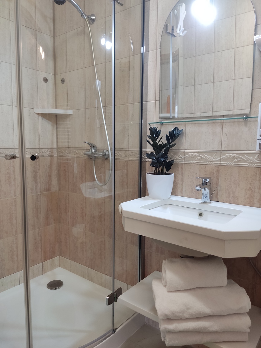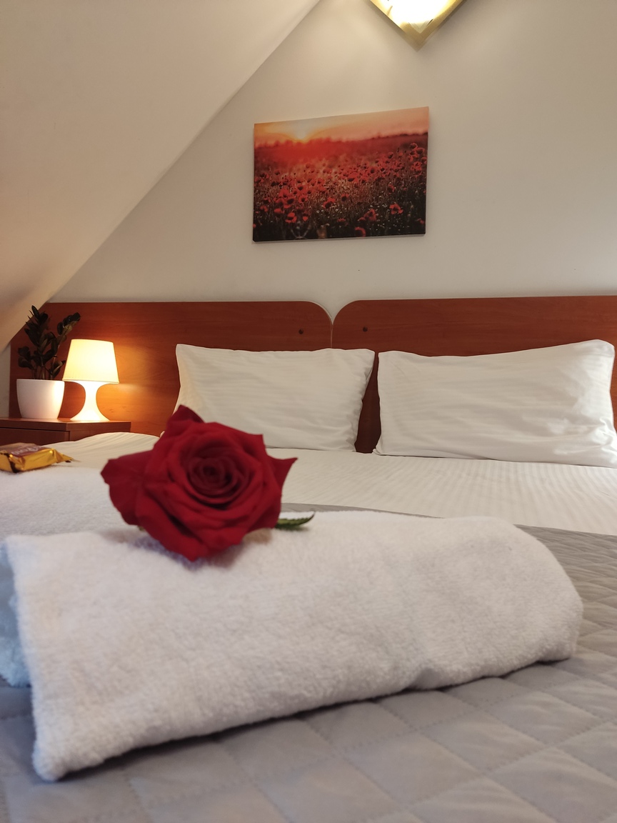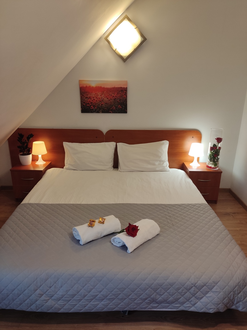 Oferujemy przestronne i klimatyzowane pokoje zawierające: łazienkę z prysznicem, łóżko (małżeńskie i pojedyncze), dużą szafę ubraniową, stolik kawowy z krzesłami, stoliki nocne, TV, Radio, bezpłatny internet Wi-Fi.