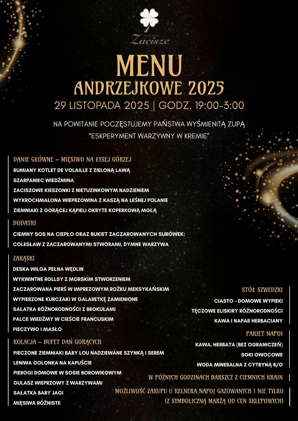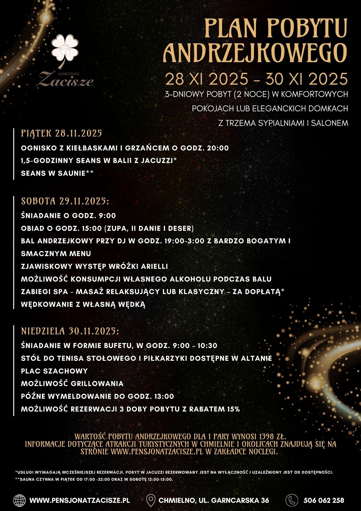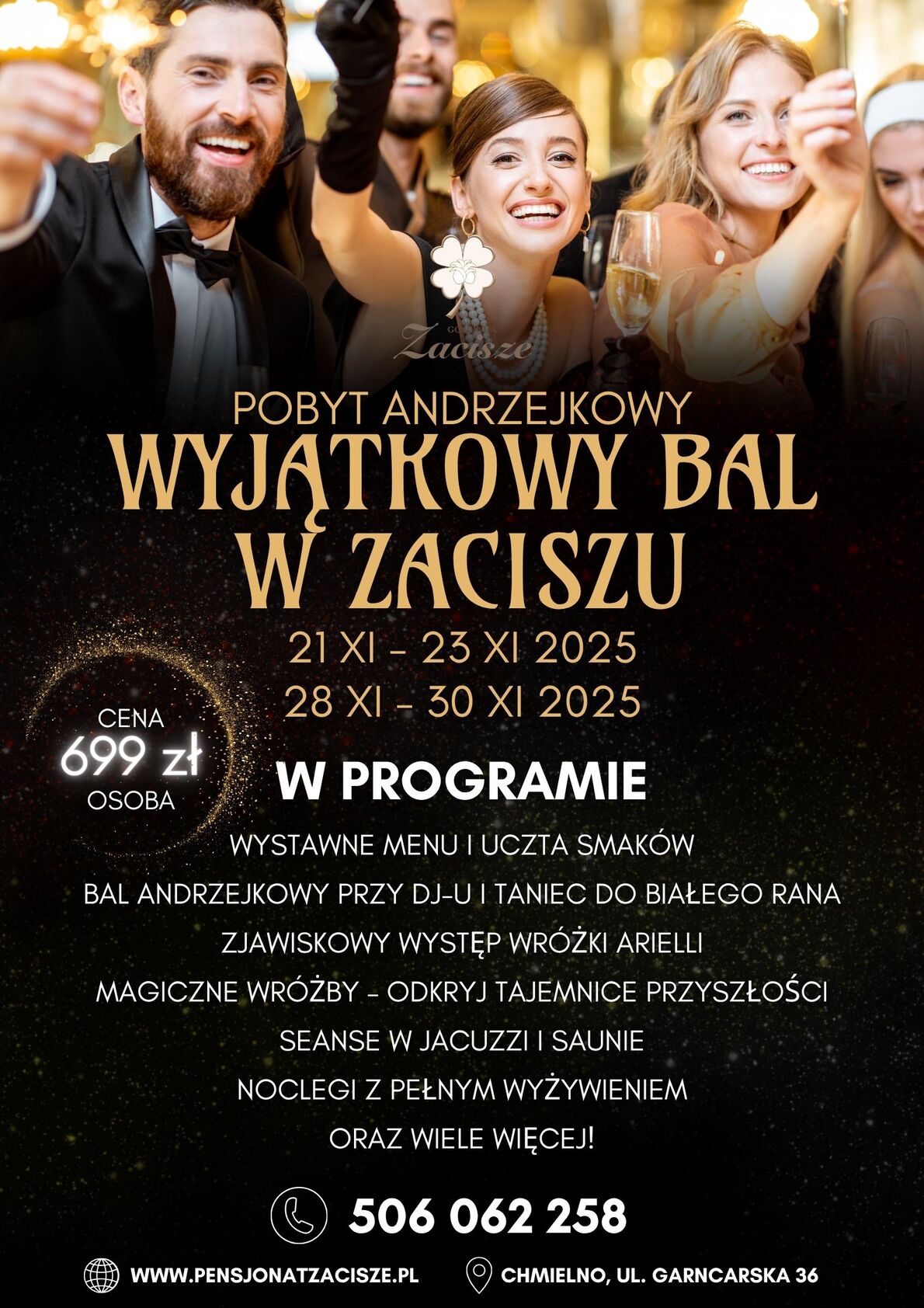 Zapraszamy na Andrzejki 2025 w Gościńcu Zacisze – elegancki bal i weekend pełen atrakcji. Czeka na Państwa muzyczne show, energetyczna zabawa z DJ-em, magiczne wróżby i wyjątkowa oprawa wieczoru z udziałem wróżki Arielli. Przygotujemy wystawne menu, bufety i domowe wypieki, a podczas wydarzenia można korzystać z własnego alkoholu. W pakiecie pobytowym: komfortowe noclegi, pełne wyżywienie, seanse w jacuzzi i saunie, ognisko z grzańcem oraz prezent dla każdego Andrzeja. Zaplanowaliśmy śniadania i obiady, bal do białego rana, możliwość masaży w strefie spa, a dla aktywnych – tenis stołowy, piłkarzyki, szachy i wędkowanie. Proponujemy również spacer po urokliwym Chmielnie oraz późne wymeldowanie, by dłużej cieszyć się relaksem. Dostępna jest rezerwacja na trzy doby z preferencyjną stawką.