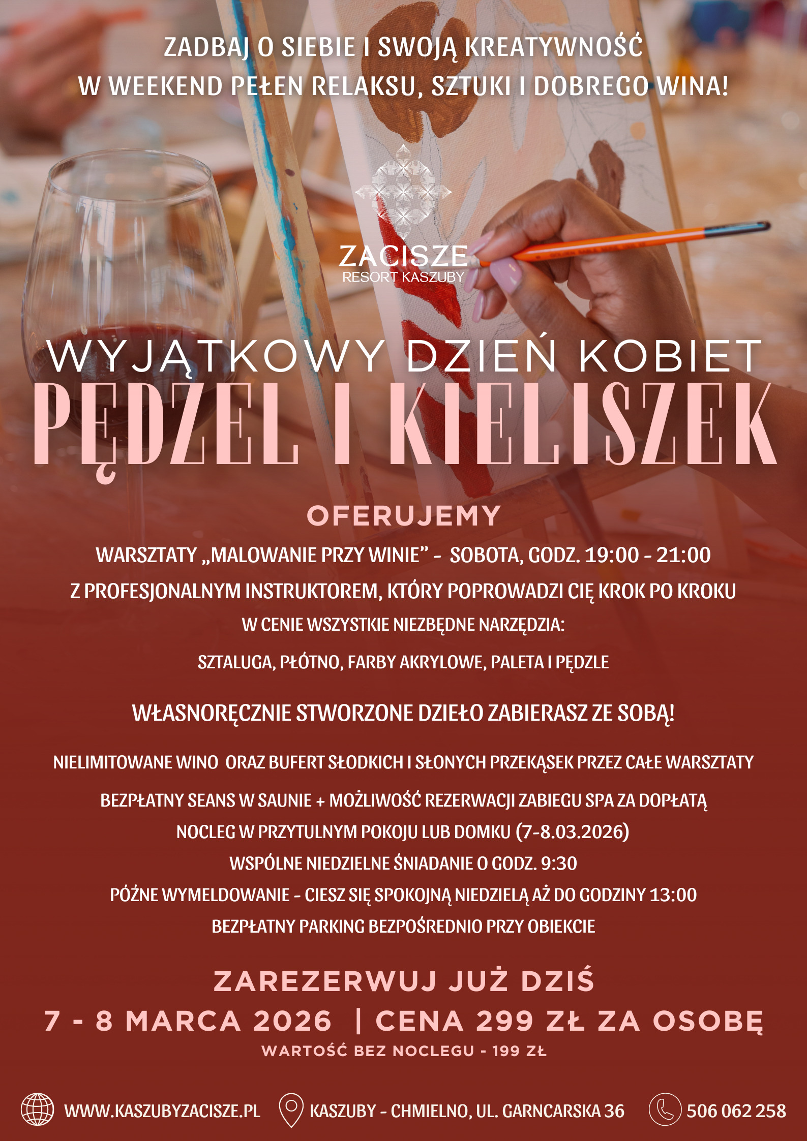 Zrób prezent swojej drugiej połówce, sobie lub przyjaciółce! Zapraszamy na kobiecy weekend w klimacie sztuki i relaksu. W programie wieczorne malowanie przy winie prowadzone krok po kroku przez instruktora, z materiałami na miejscu i obrazem do zabrania ze sobą. Do tego swobodna atmosfera, przekąski i wino, czas na regenerację oraz możliwość skorzystania ze strefy wellness. Czeka też chwila w saunie, przestrzeń do rozmów i śmiechu oraz kameralny klimat, który sprzyja wyciszeniu. W pakiecie nocleg i spokojny poranek ze wspólnym śniadaniem, by wrócić do domu z energią. Zrelaksuj się, twórz i celebruj kobiecość razem 7 i 8 marca 2026.