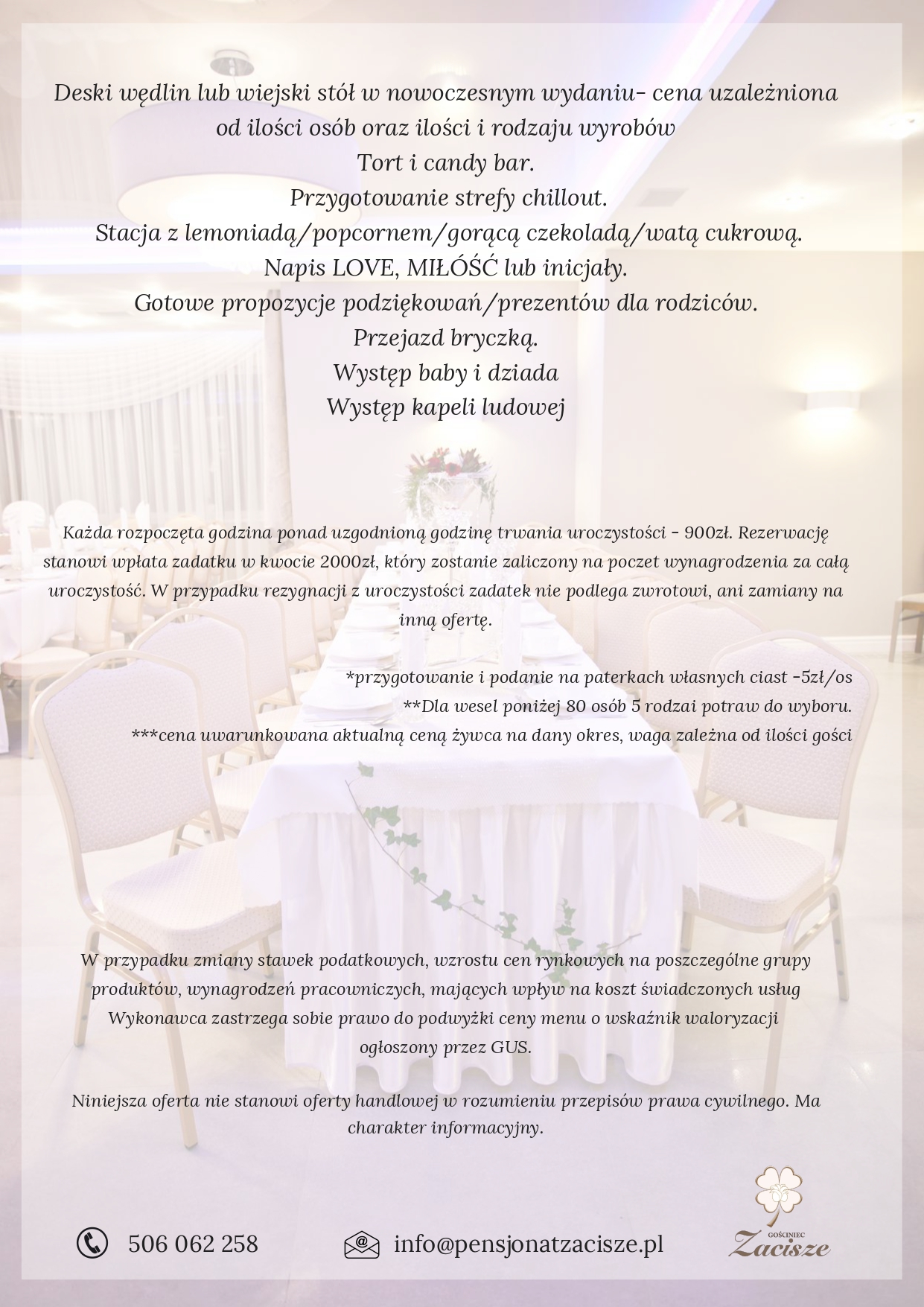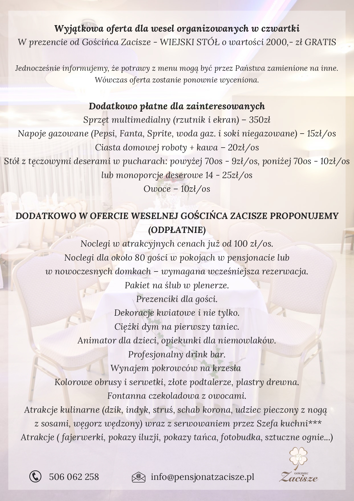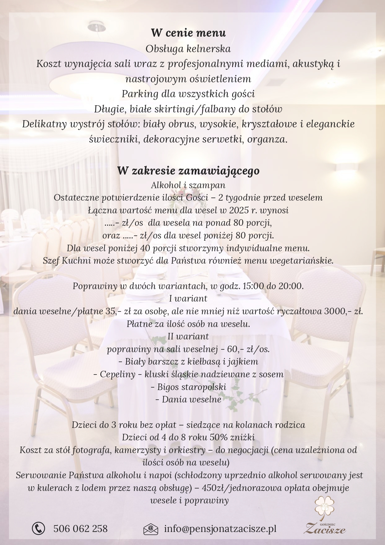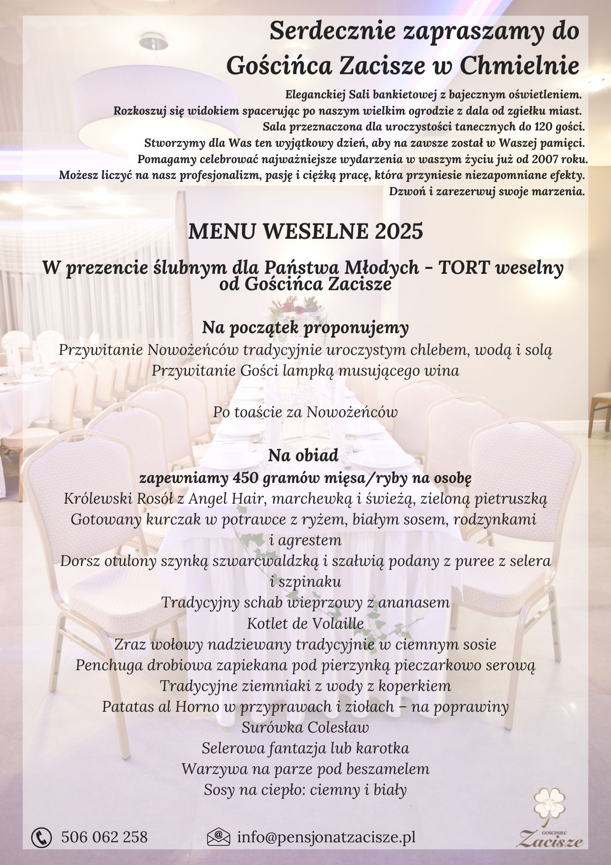 Nasz Szef Kuchni przygotował dla Państwa wyśmienite i skomponowane Menu Weselne. Zapraszamy do zapoznania się z ofertą Menu Weselnego w Gościńcu Zacisze w Chmielnie.
